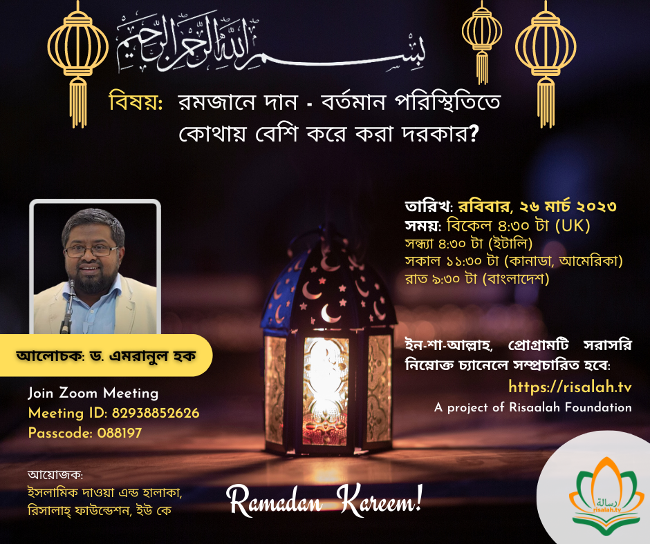 26 Apr Bengali Program: রমজানে দান - বর্তমান পরিস্থিতিতে কোথায় বেশি করে করা দরকার? - আলোচক: ড. এমরানুল হক Nature: General Halaqah Type: Single Length (Minuts): 92 Audience Target: Sponsor: List of Speaker: Dr. Emranul Haque Items to be used for: Publish Date Time: 2026-04-26 11:30:00 am Program Description: Bengali Program: সন্তানদের গড়ে তোলার ক্ষেত্রে বাবা-মায়ের জন্য বর্তমান সমাজের চ্যালেঞ্জ - দ্বিতীয় পর্ব by Dr. Emranul Haque