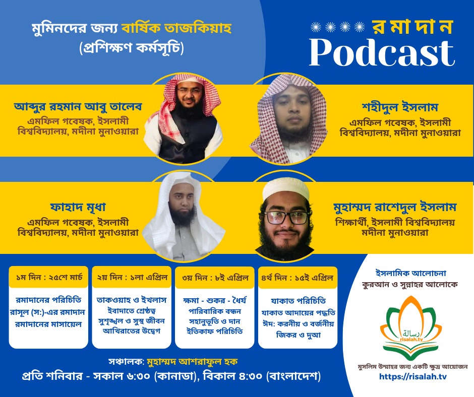রমাদান Podcast (প্রতি শনিবার বাংলাদেশ সময় বিকাল ৪টায়) বিষয়: মুমিনদের জন্য বার্ষিক তাজকিয়াহ (প্রশিক্ষণ কর্মসূচি) - কুরআন ও সুন্নাহর আলোকে আলোচনা রাখবেন: মদিনা বিশ্ববিদ্যালয়ের কিছু তরুণ আলেম